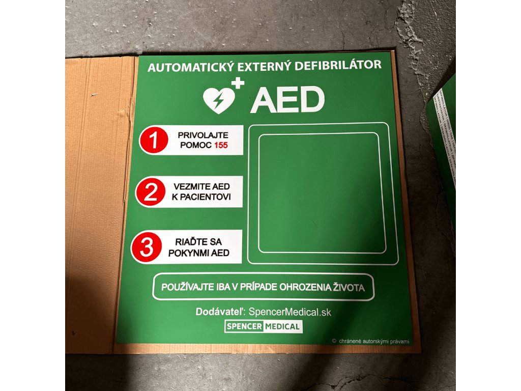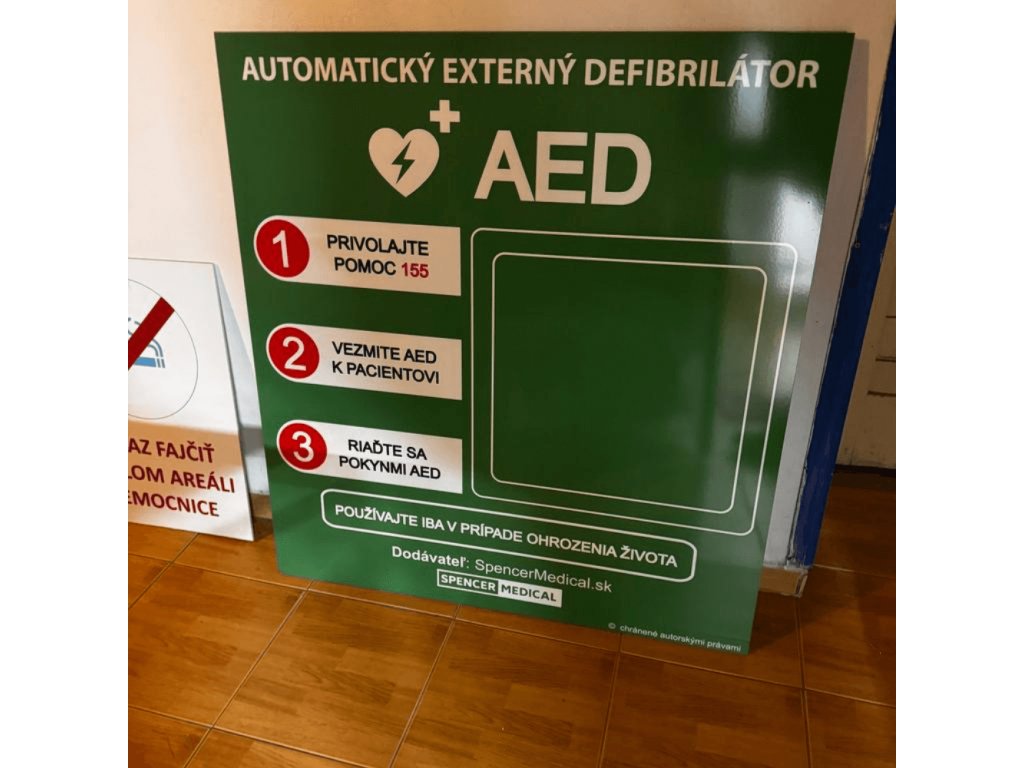 Pre tento účel máme pre vás pripravenú tabuľu prvej pomoci, ktorá sa dá umiestniť za samotný AED defibrilátor so skrinkou.